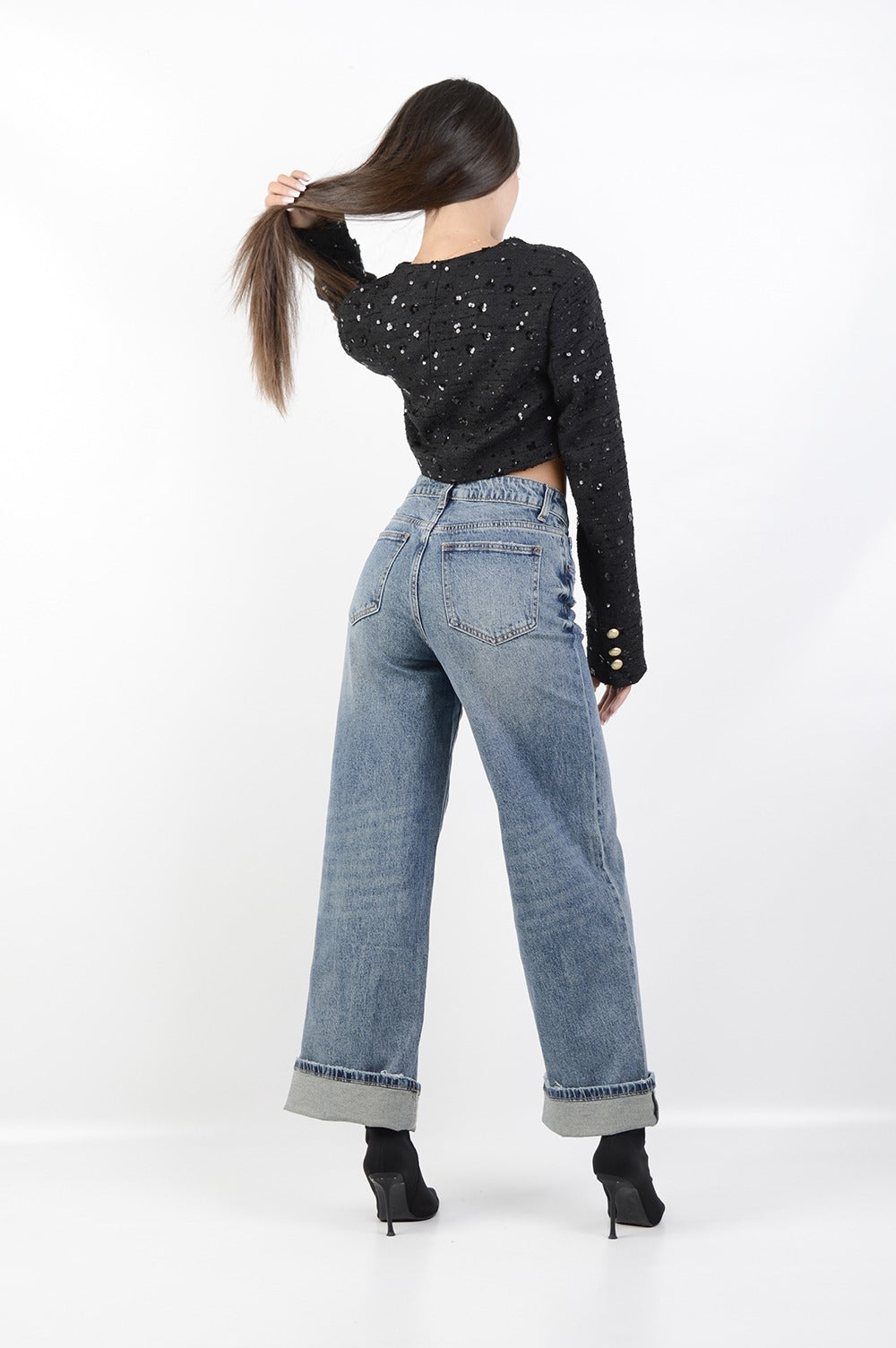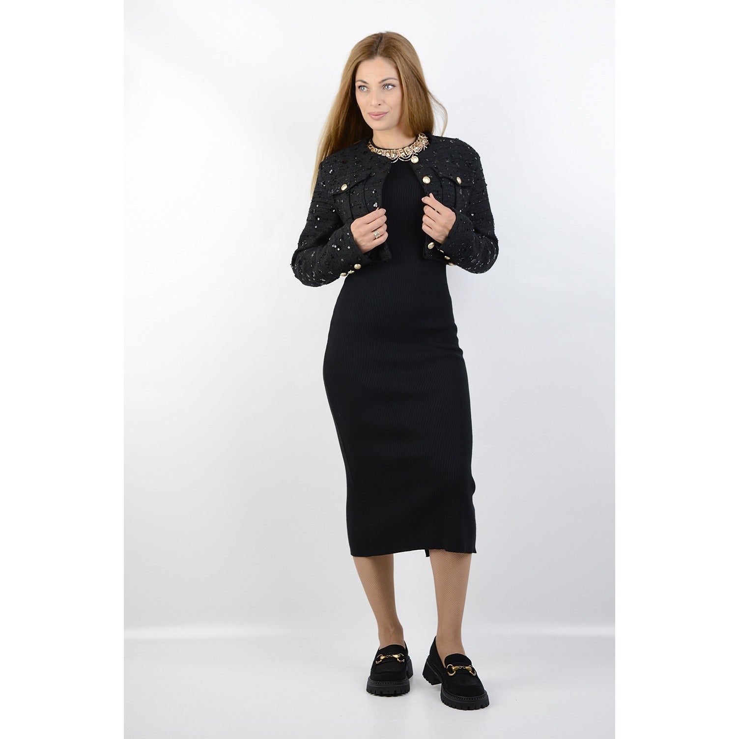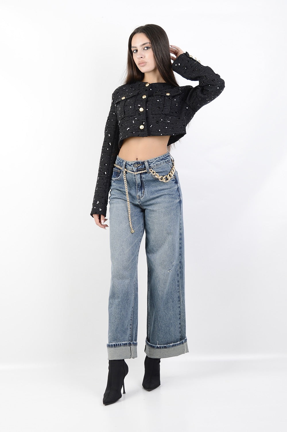 Стилно късо сако в черно, украсено с блестящи елементи и акценти златни копчета. Моделът е със свободна линия и дълги ръкави- идеален за комбинация с дънки или с рокля, панталон за вечерен акцент.
