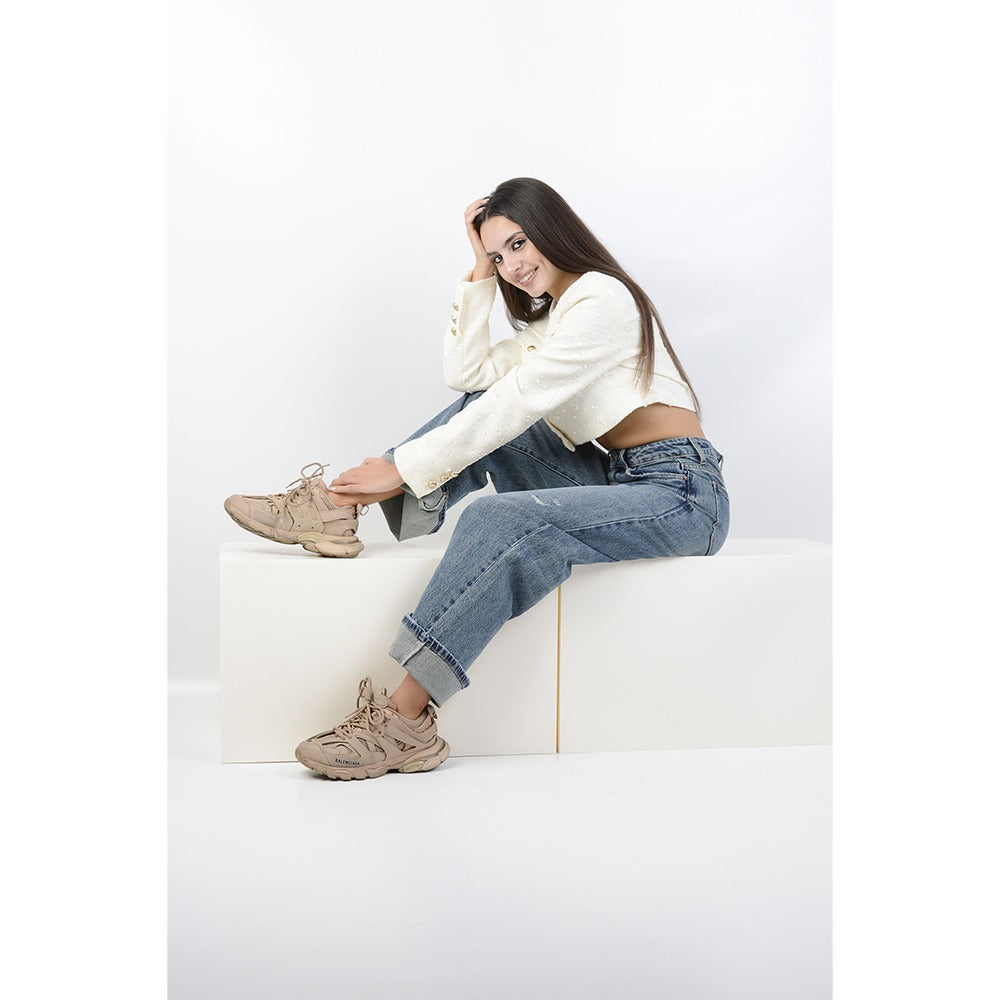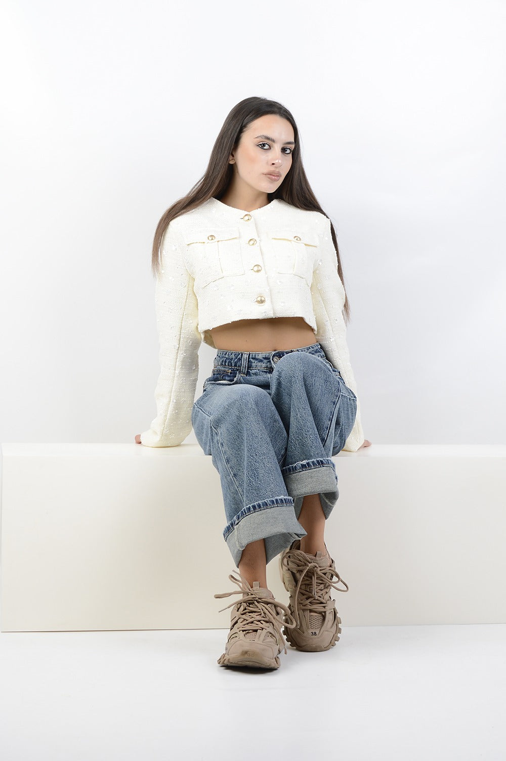 Стилно късо сако в бяло, украсено с блестящи елементи и акценти златни копчета. Моделът е със свободна линия и дълги ръкави- идеален за комбинация с дънки или с рокля, панталон за вечерен акцент.