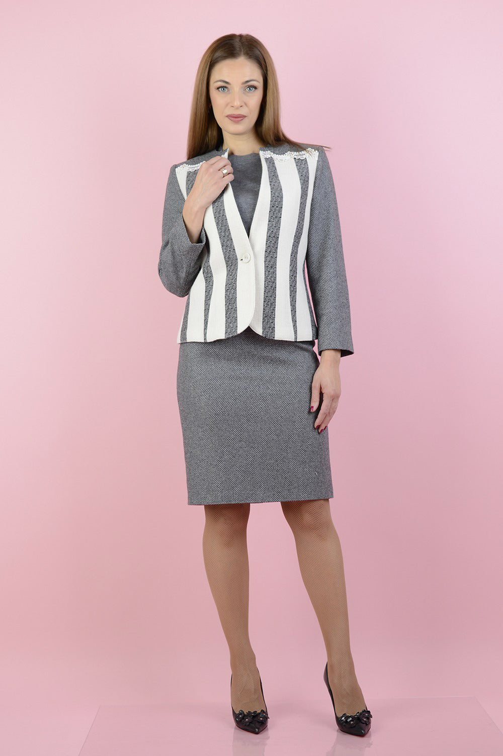 Стилен комплект за модерната жена, която предпочита класиката с характер. Сакото с декоративни линии и фин акцент от дантела, а правата пола завършва визията. Перфектен избор за делови дни, презентации или празнични събития...