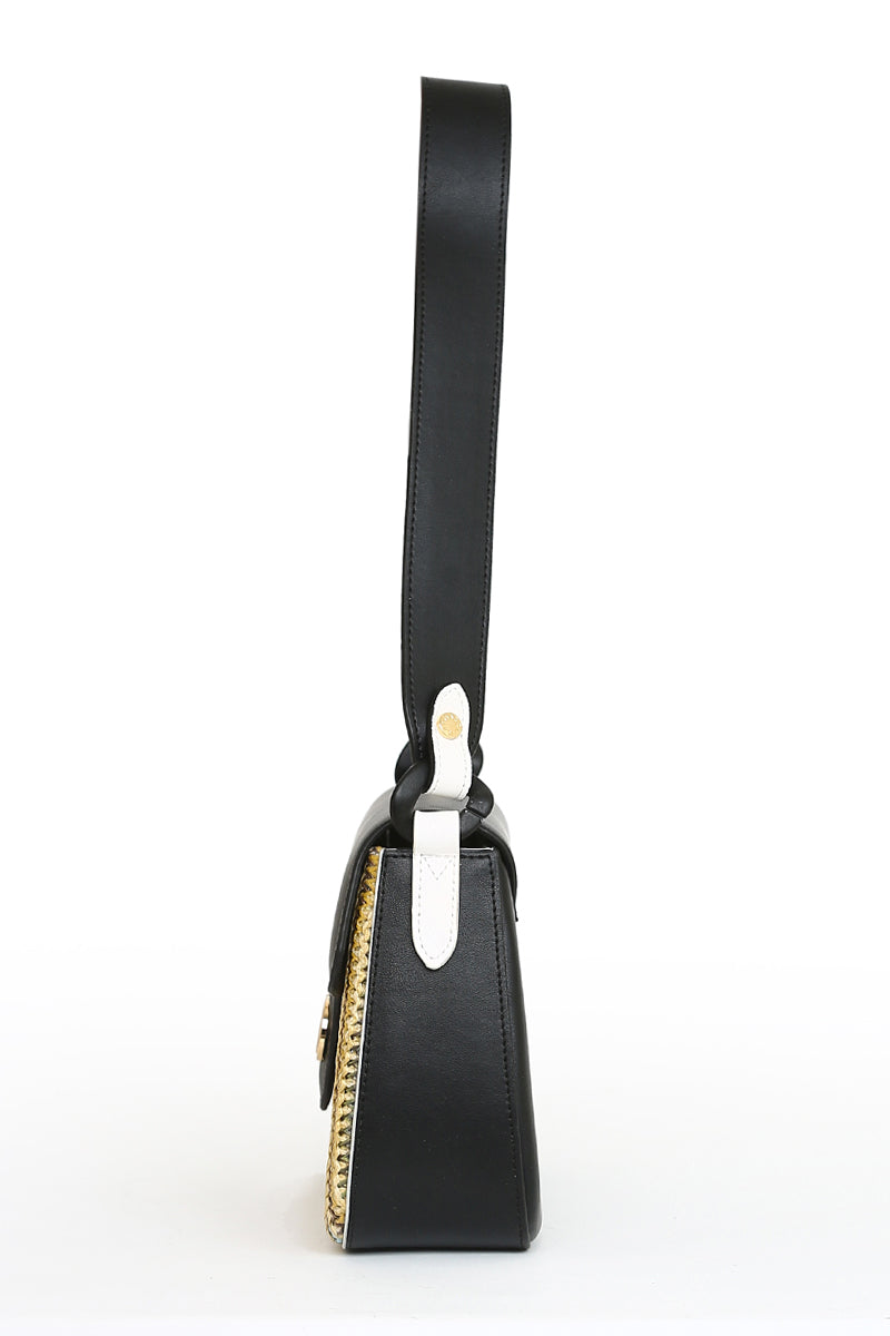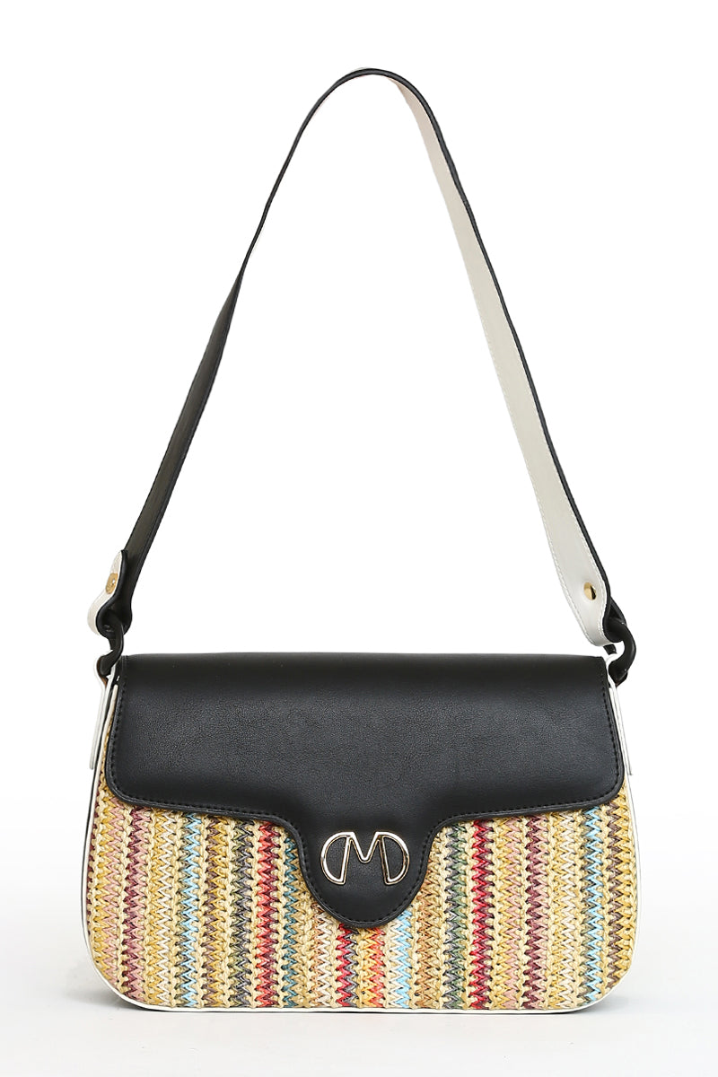 ...чанта за ръка и през рамо...изработена м/у комбинация от екологична кожа в черен цвят и плетен материал...магнитно закопчаване...вътрешно подплатена и един джоб...
