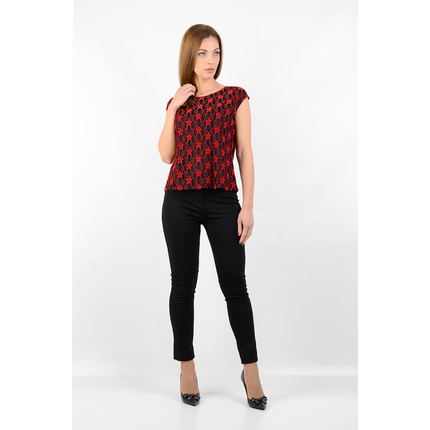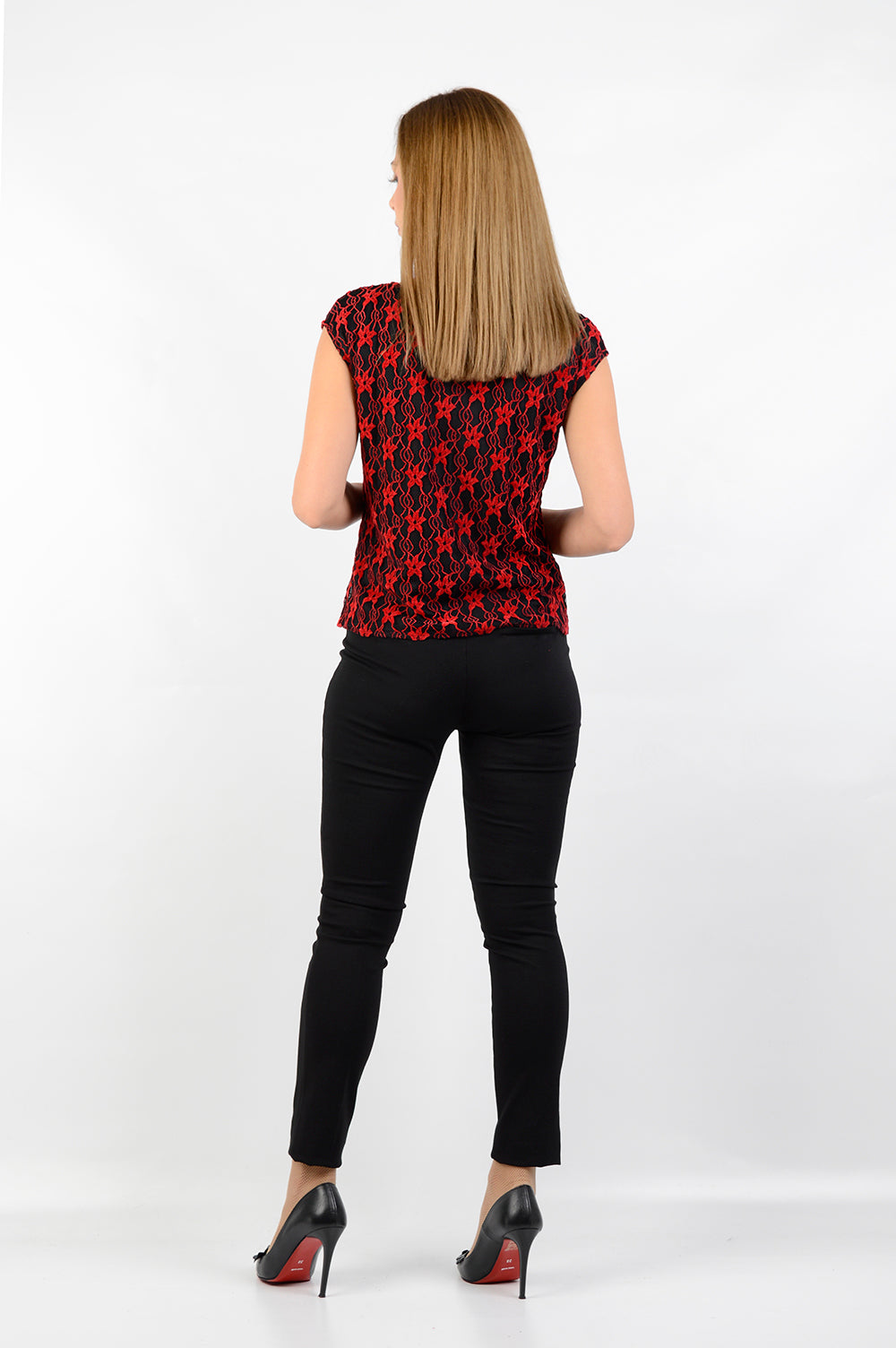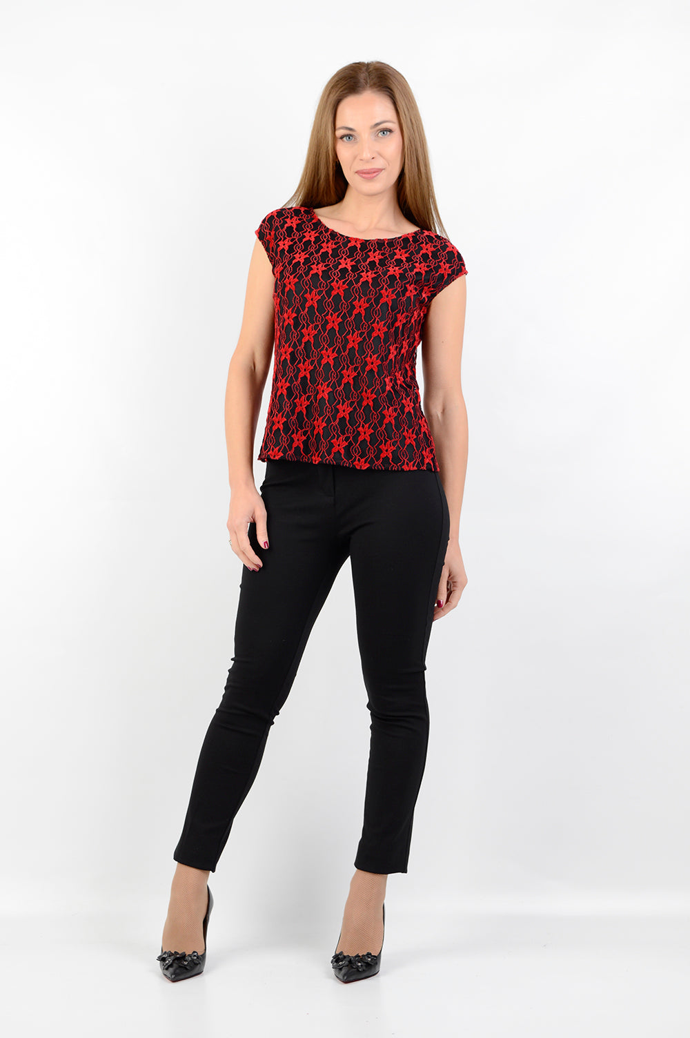 Елегантен топ с впечатляваща дантелена шарка в червено върху черна основа. Еластичен и удобен, той придава стил и женственост на всяка визия. Подплатен с еластичен хастар.