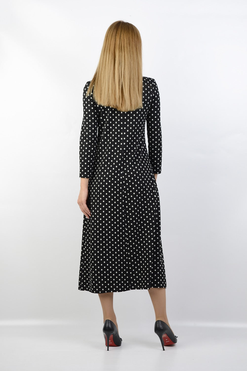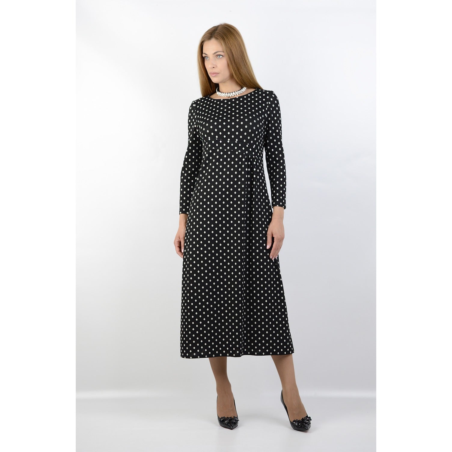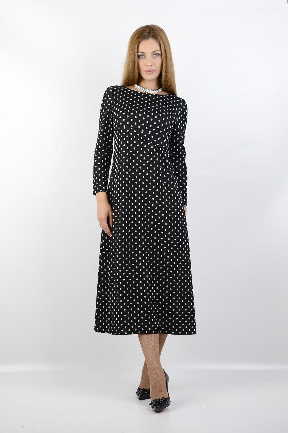 ...дълга рокля изработена от висококачествено трико...подплатена с хастар...свободната линия с асиметричен акцент, пада красиво и женствено, а десенът на точки добавя свежест и непреходност...