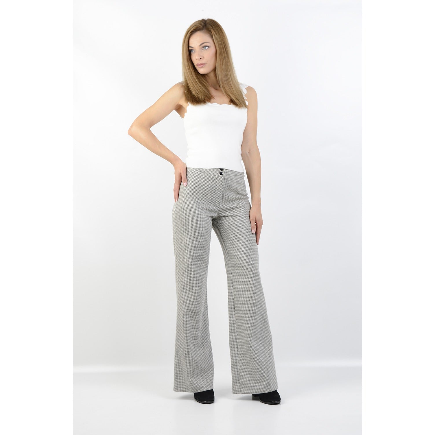 ...стилен панталон изработен от еластична и удобна материя, моделът е с висока талия,права линия с леко разкрояване в долната част, което издължава силуета и придава елегантно излъчване...