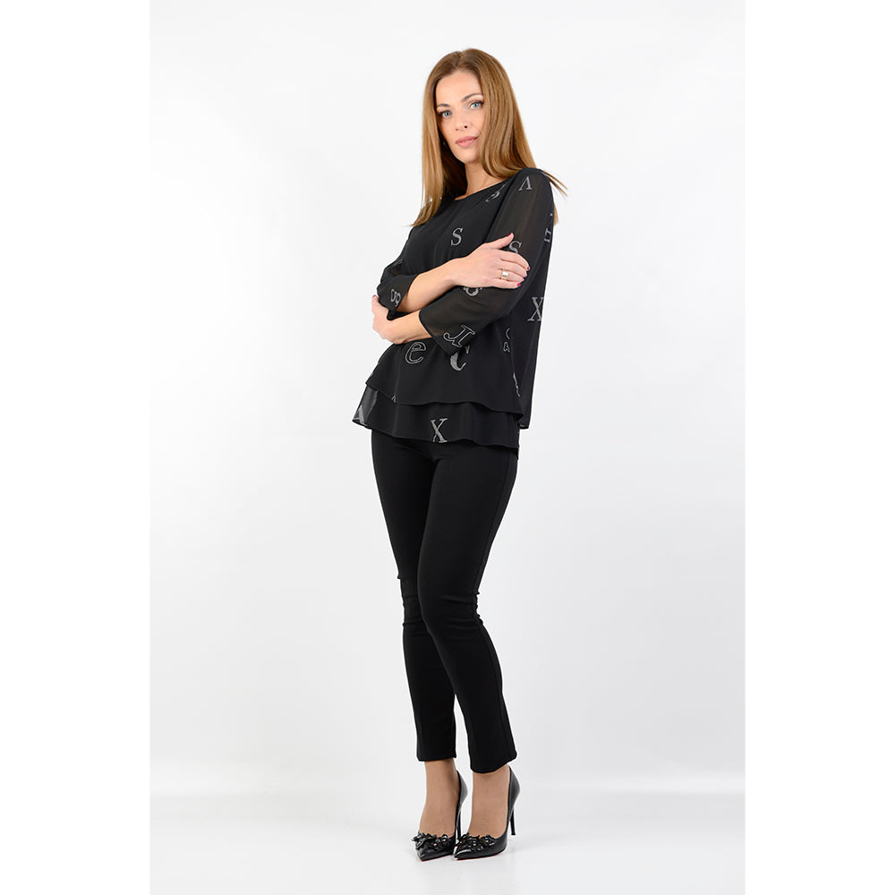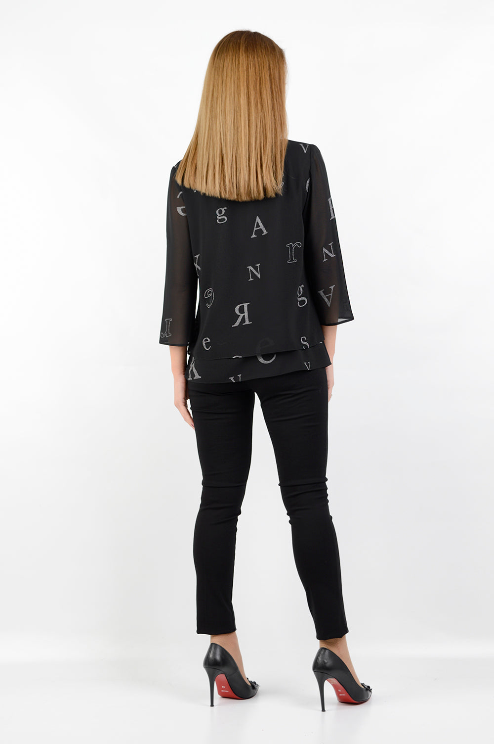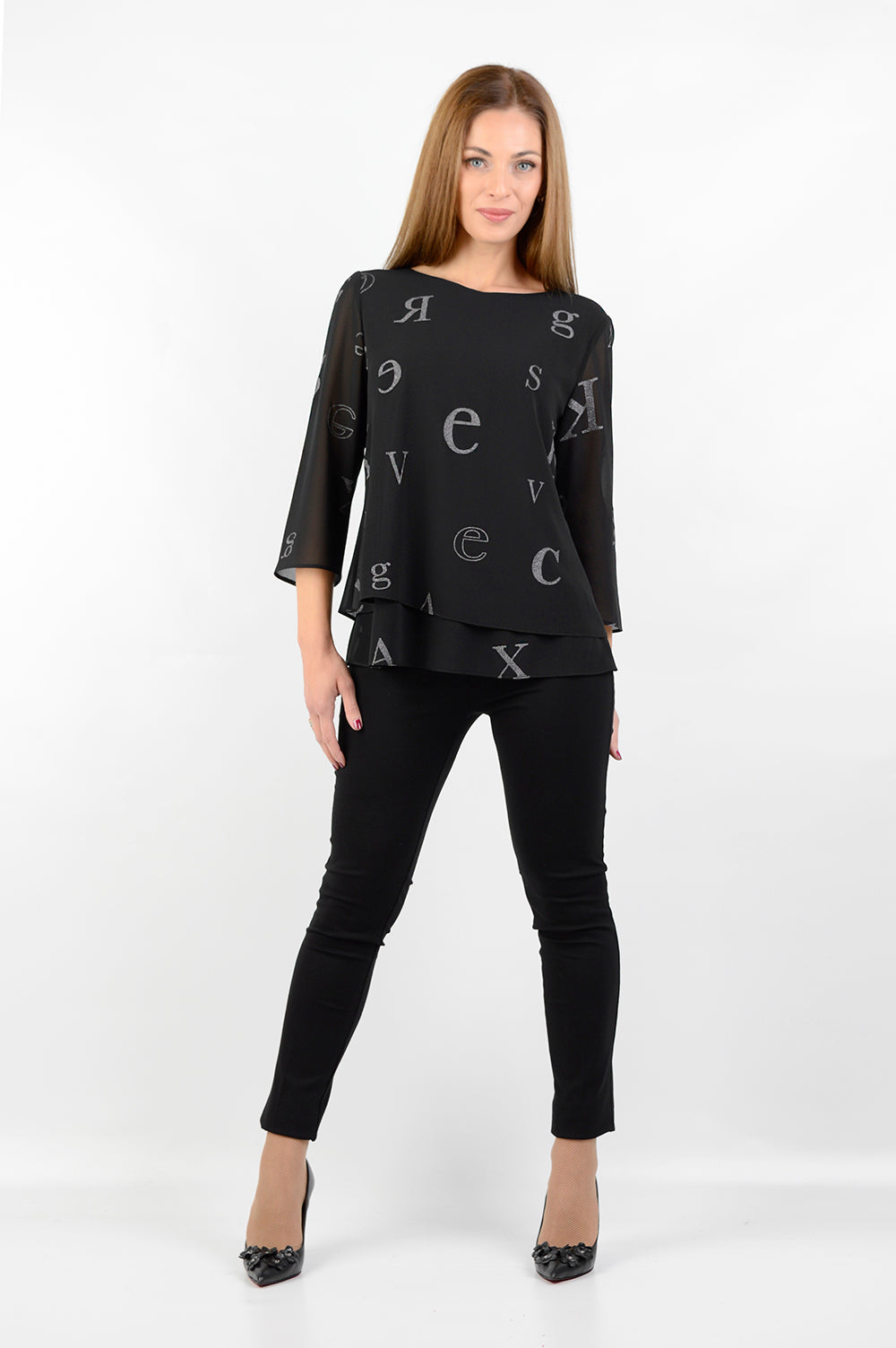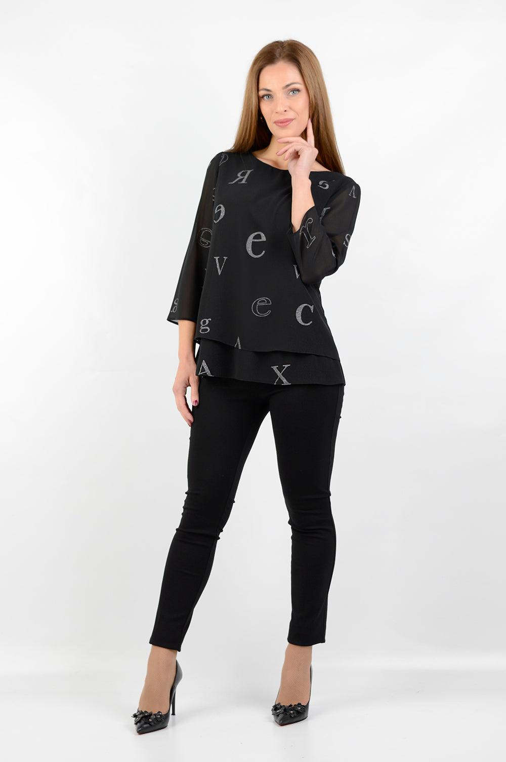 Стилна блуза от шифон в черно с удобен непрозрачен хастар. Двуслойната линия пада красиво и прикрива силуета, а металическите букви добавят модерен акцент. Подходяща за ежедневна елегантност, офис или по-специални поводи.