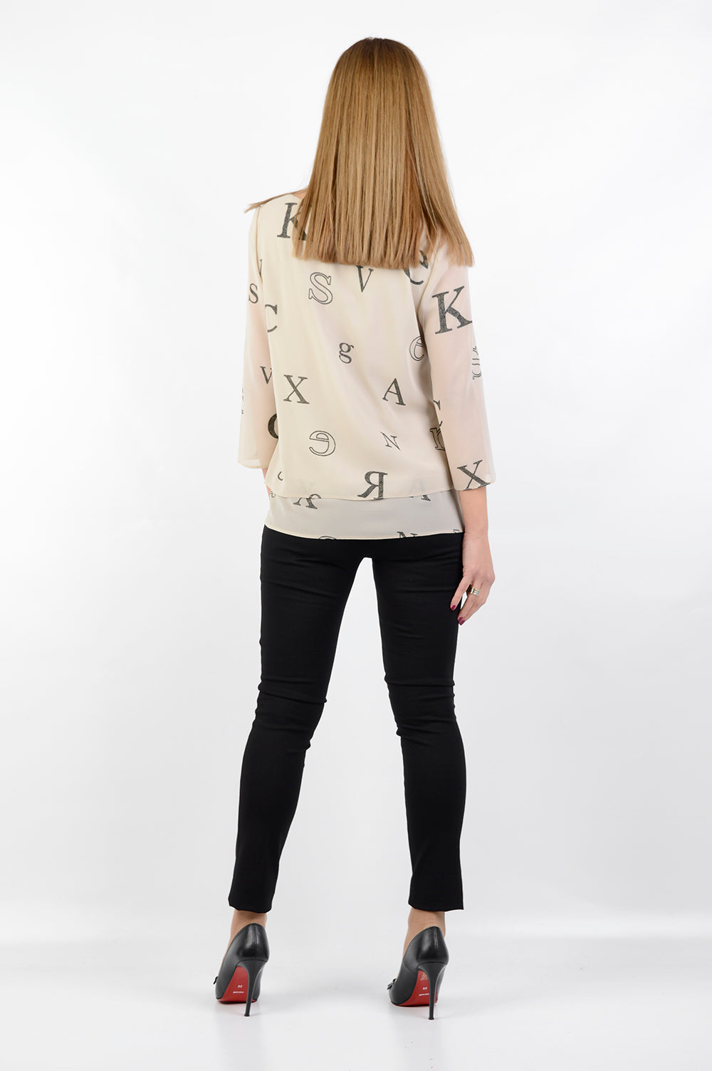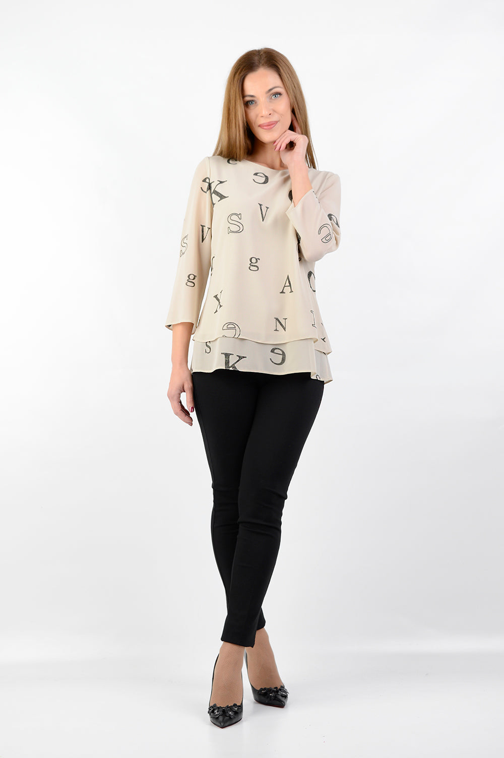 Стилна блуза от  шифон в черно с удобен непрозрачен хастар. Двуслойната линия пада красиво и прикрива силуета, а металическите букви добавят модерен акцент. Подходяща за ежедневна елегантност, офис или по-специални поводи.