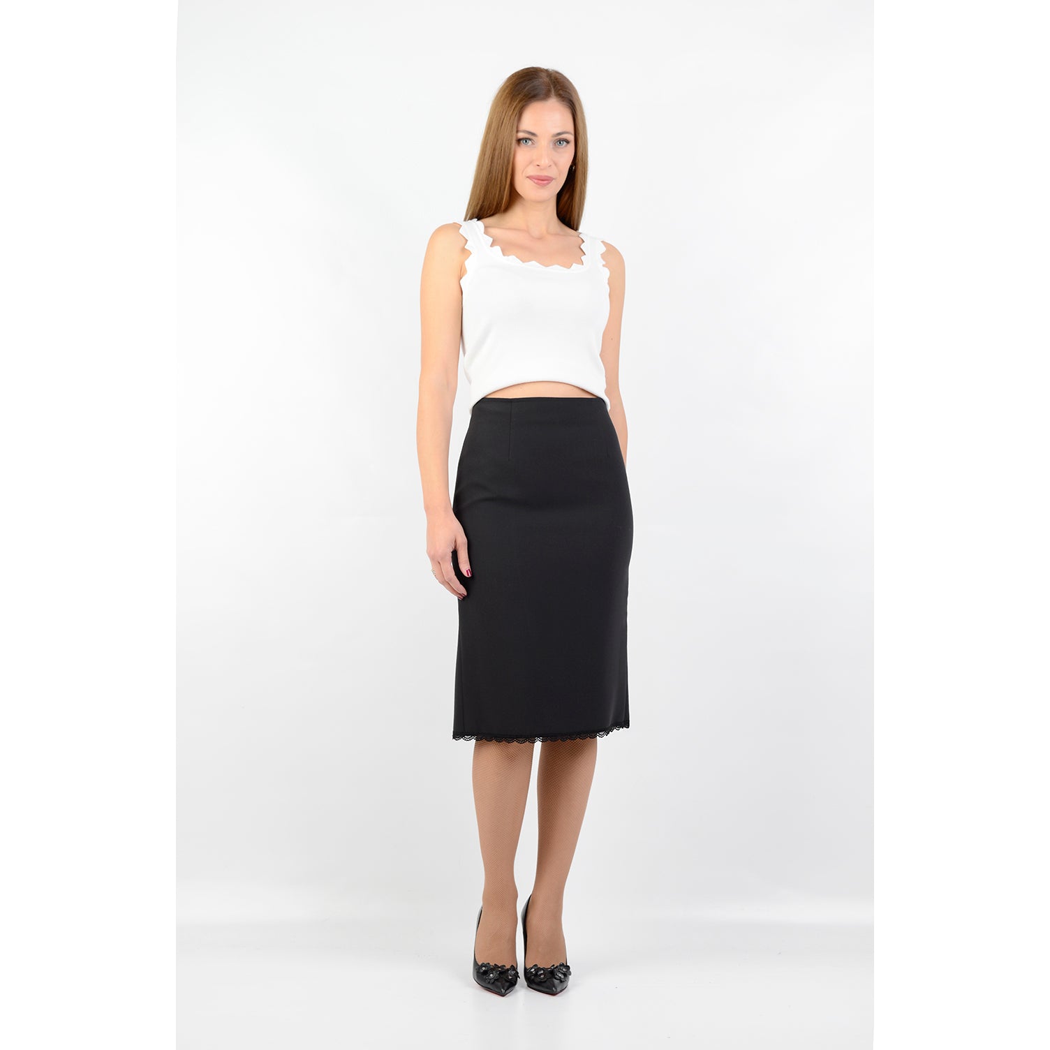 Изискана черна пола, права отпред и с разкроена линия отзад за красиво движение и женствен силует. Подгъвът е завършен с фина дантела, която добавя деликатен акцент. Подплатена с хастар.