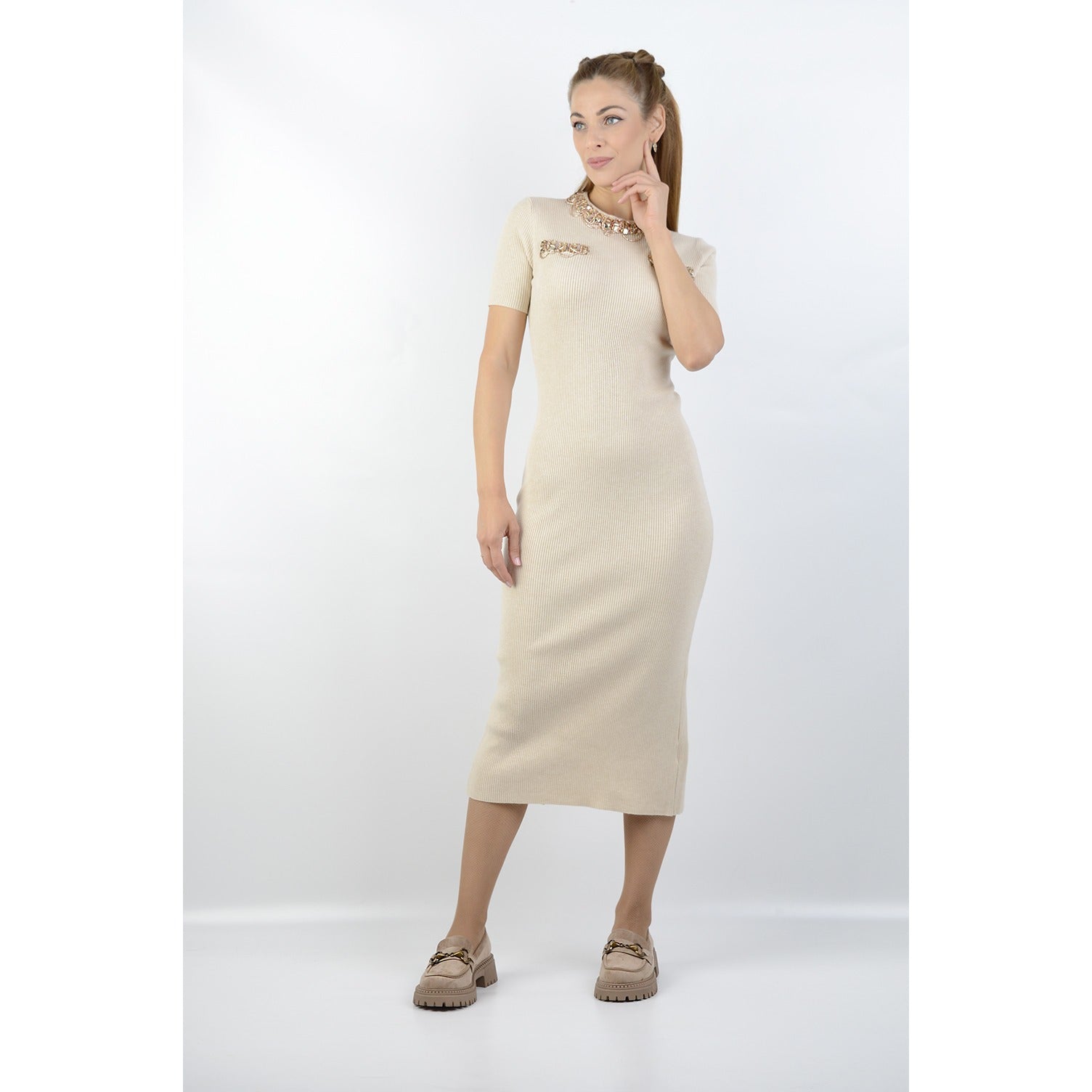 Елегантна рокля по тялото с дължина под коляното. Моделът е с къс ръкав и апликация от златисти тонове около деклотето и върху бюста - ефектен акцент, който прави визията изискана и стилна...