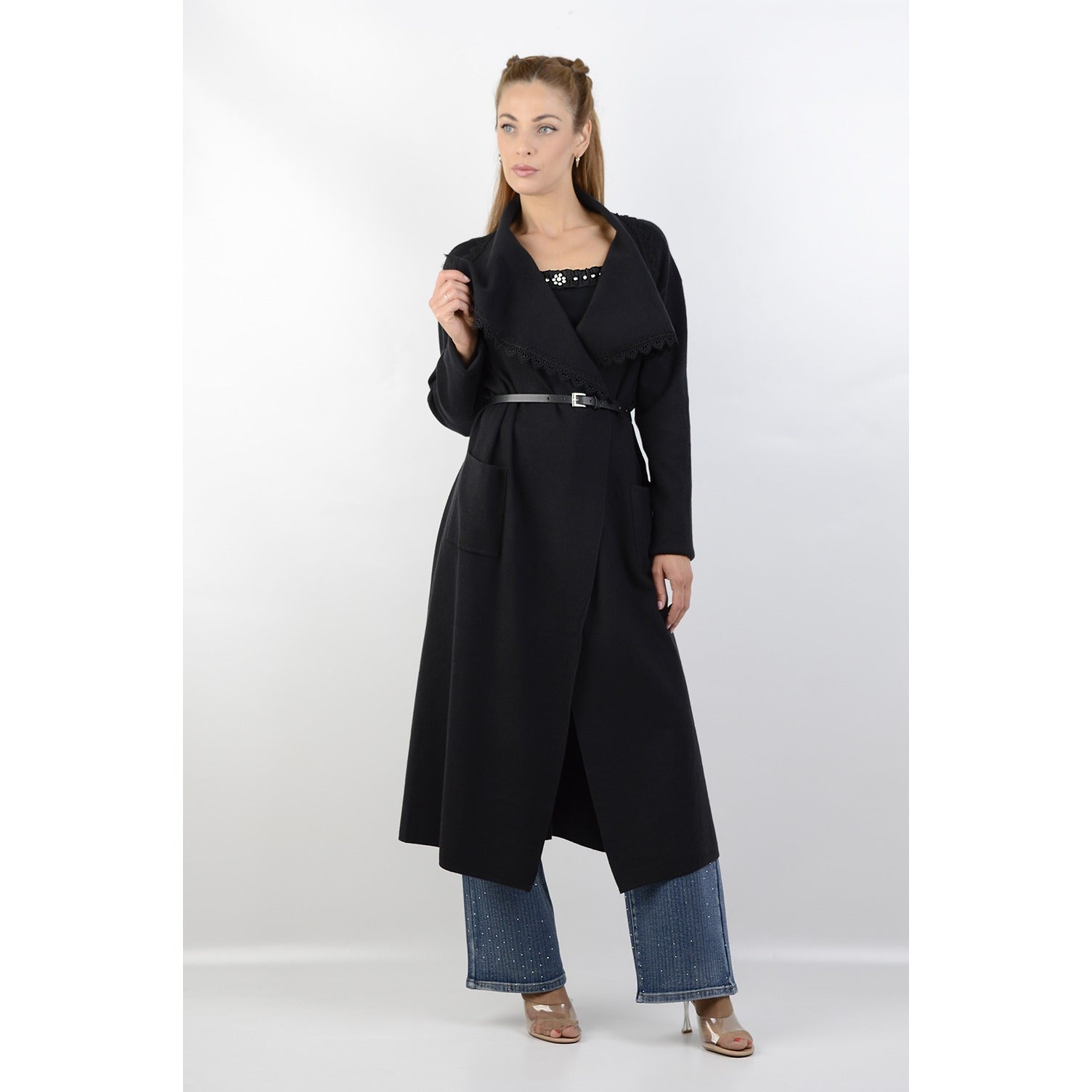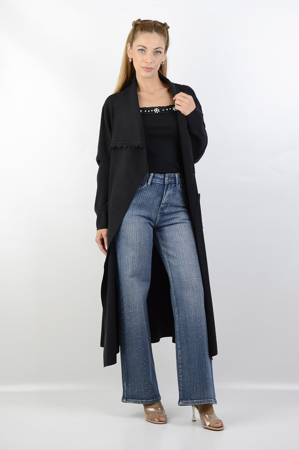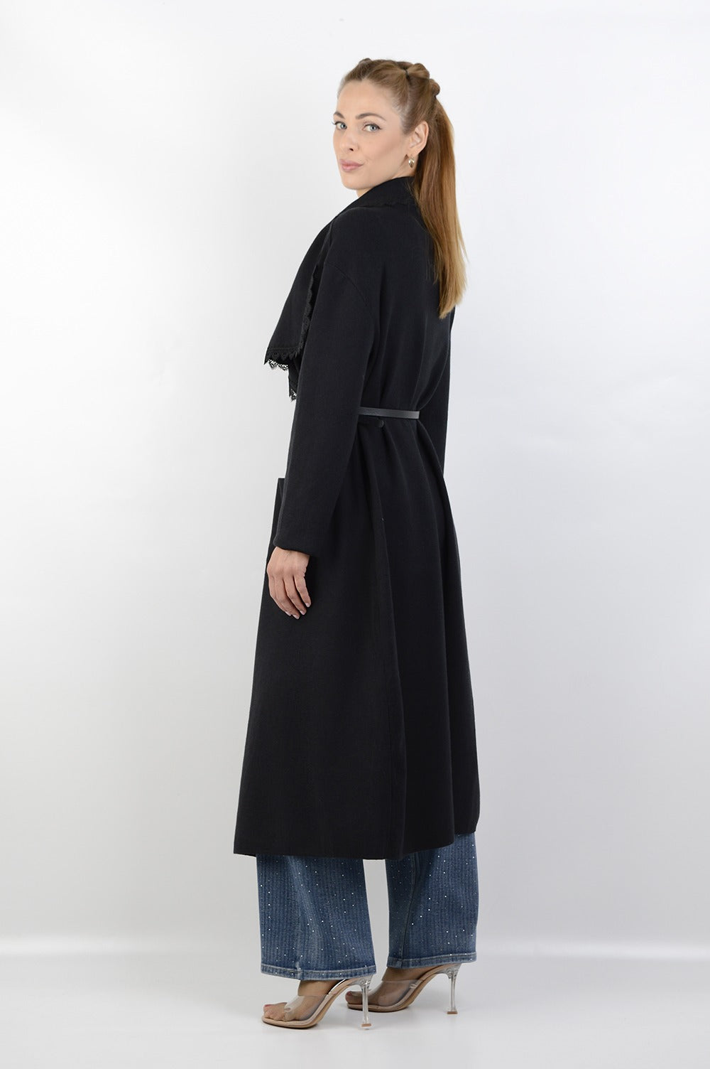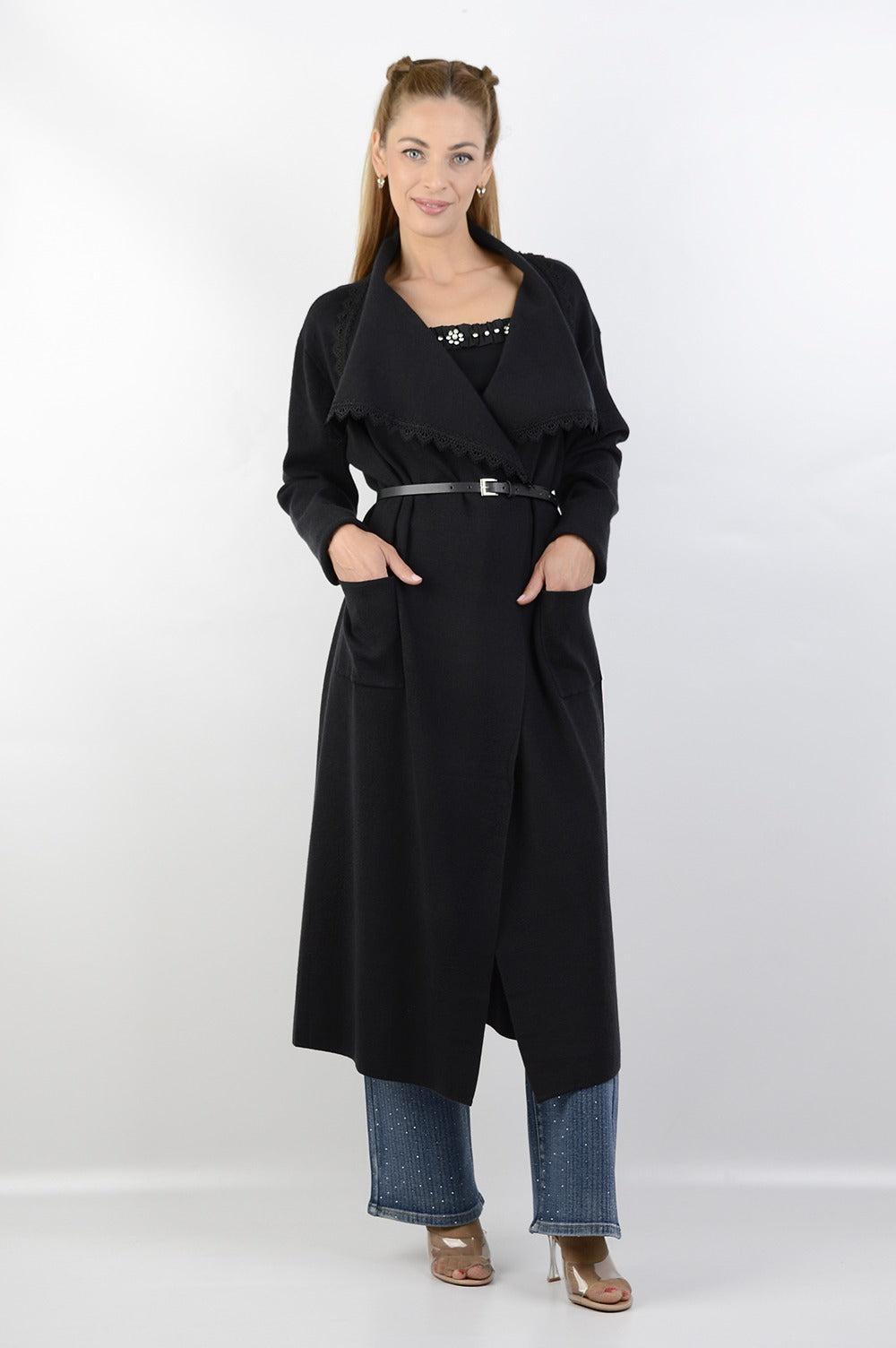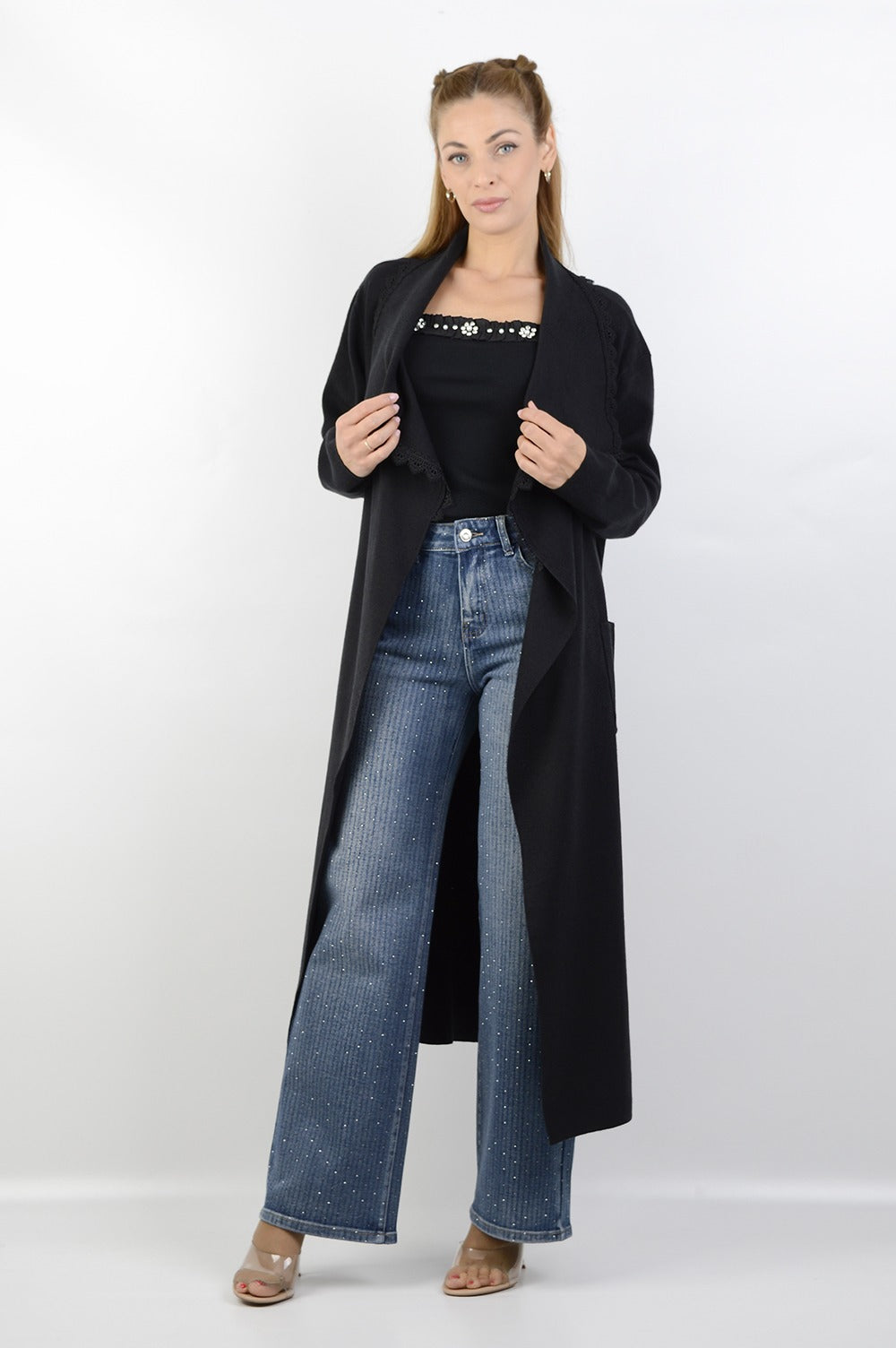 Стилна и универсална жилетка с дължина до глезените. Моделът е с мека линия и подаща яка, украсена с деликатен кант. Допълнена с тънък колан, който подчертава визията , и практични джобове отпред.