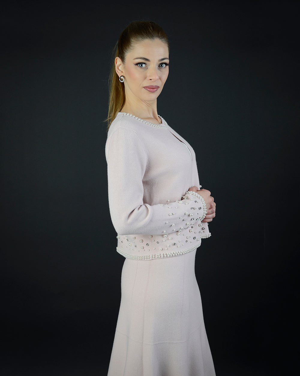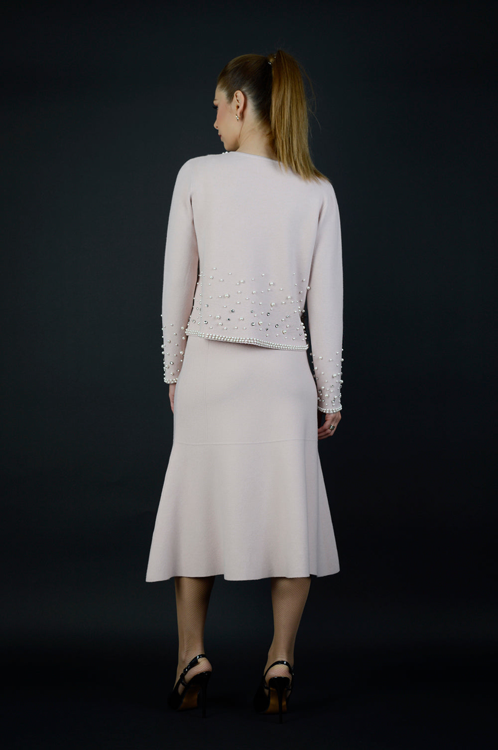 Нежен розов цвят на зимната жилетка с изчистена линия и богата перлена декорация, разположена както отпред ,така и на гърба. Моделът е с фино оформено деклоте и елегантно завършени ръкави, което се придава завършено и женствен силует. Може да се съчетае с пола от същия цвят за стилен и хармоничен комплект.