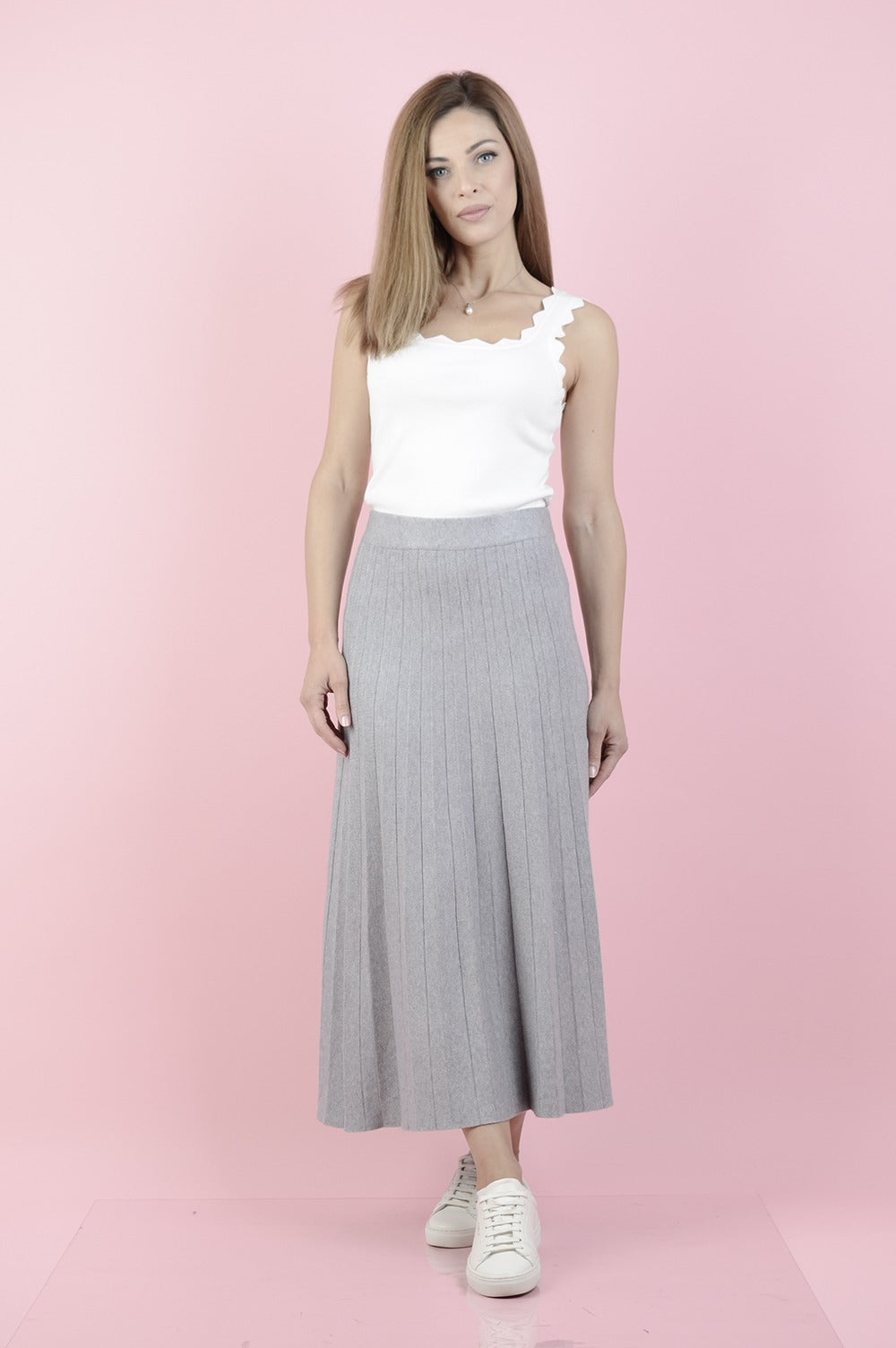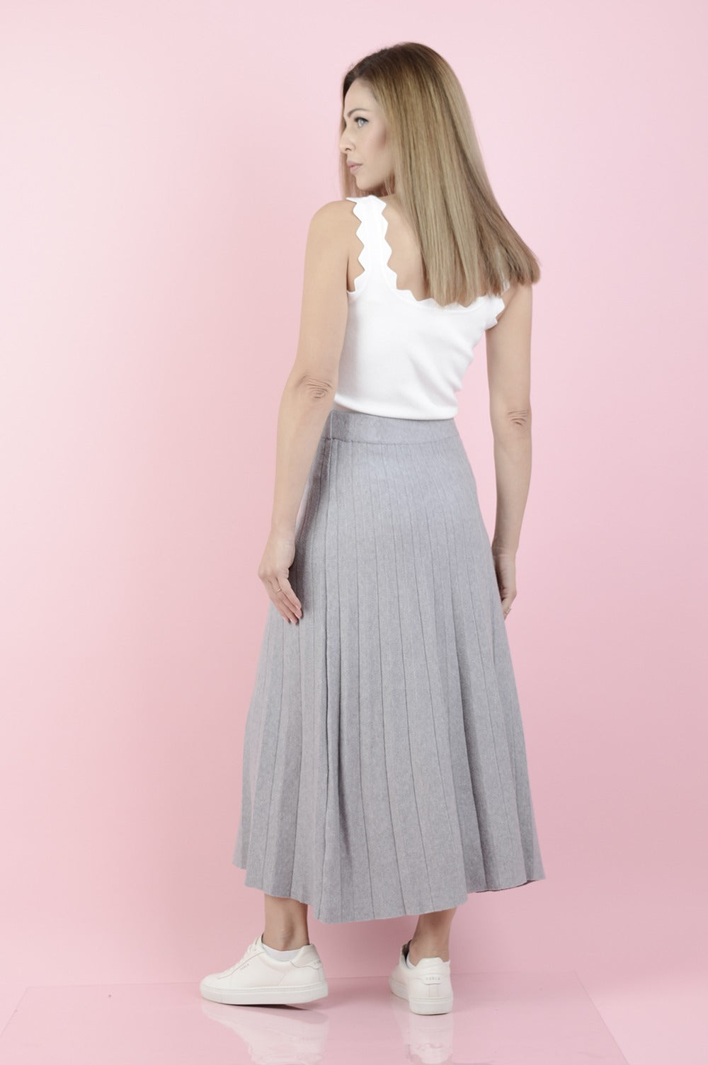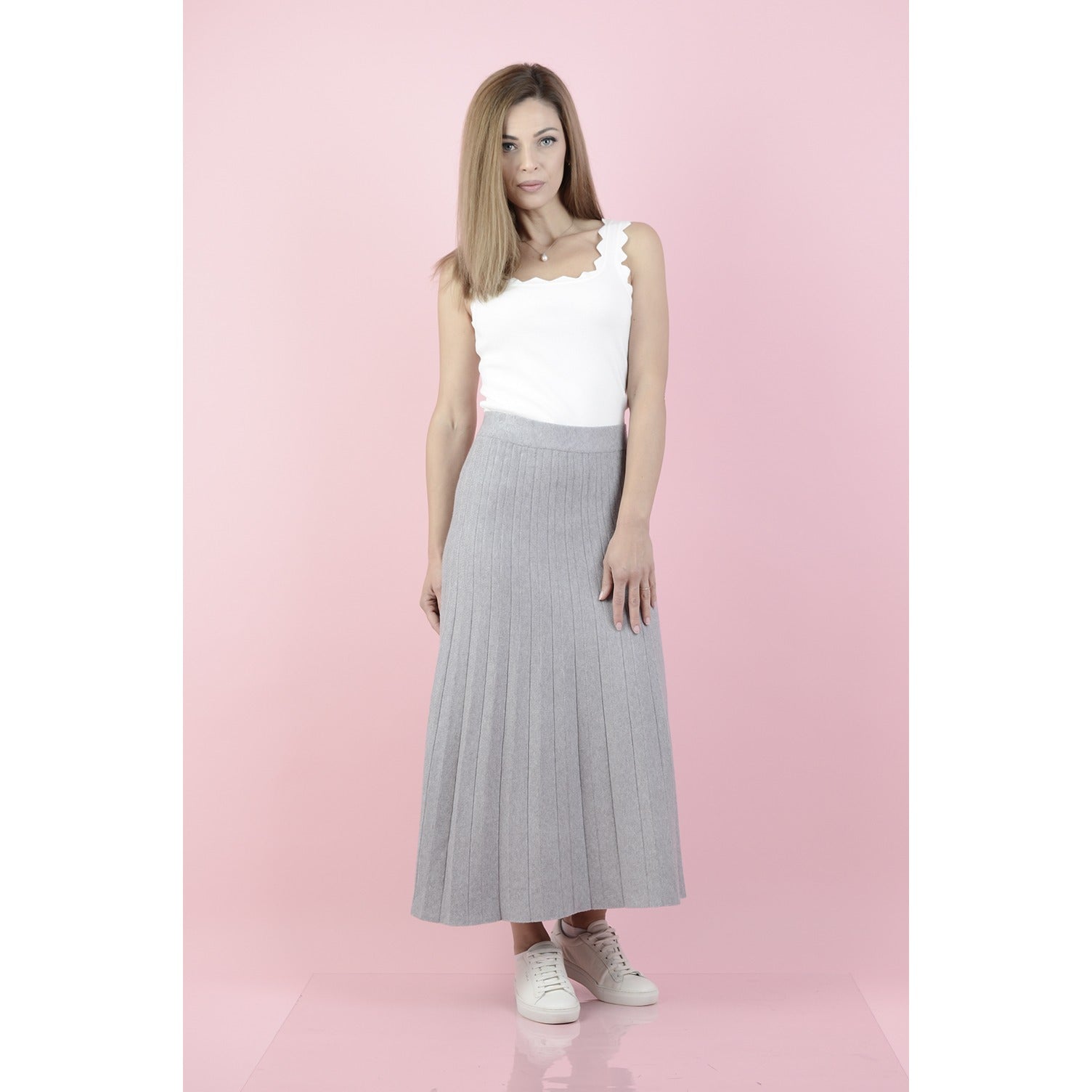 ...елегантна и удобна пола, изработена от мека и еластична плетена материя...фините гънки придават лекота и жентственост, а сивият цвят прави модела лесен за съчетание...