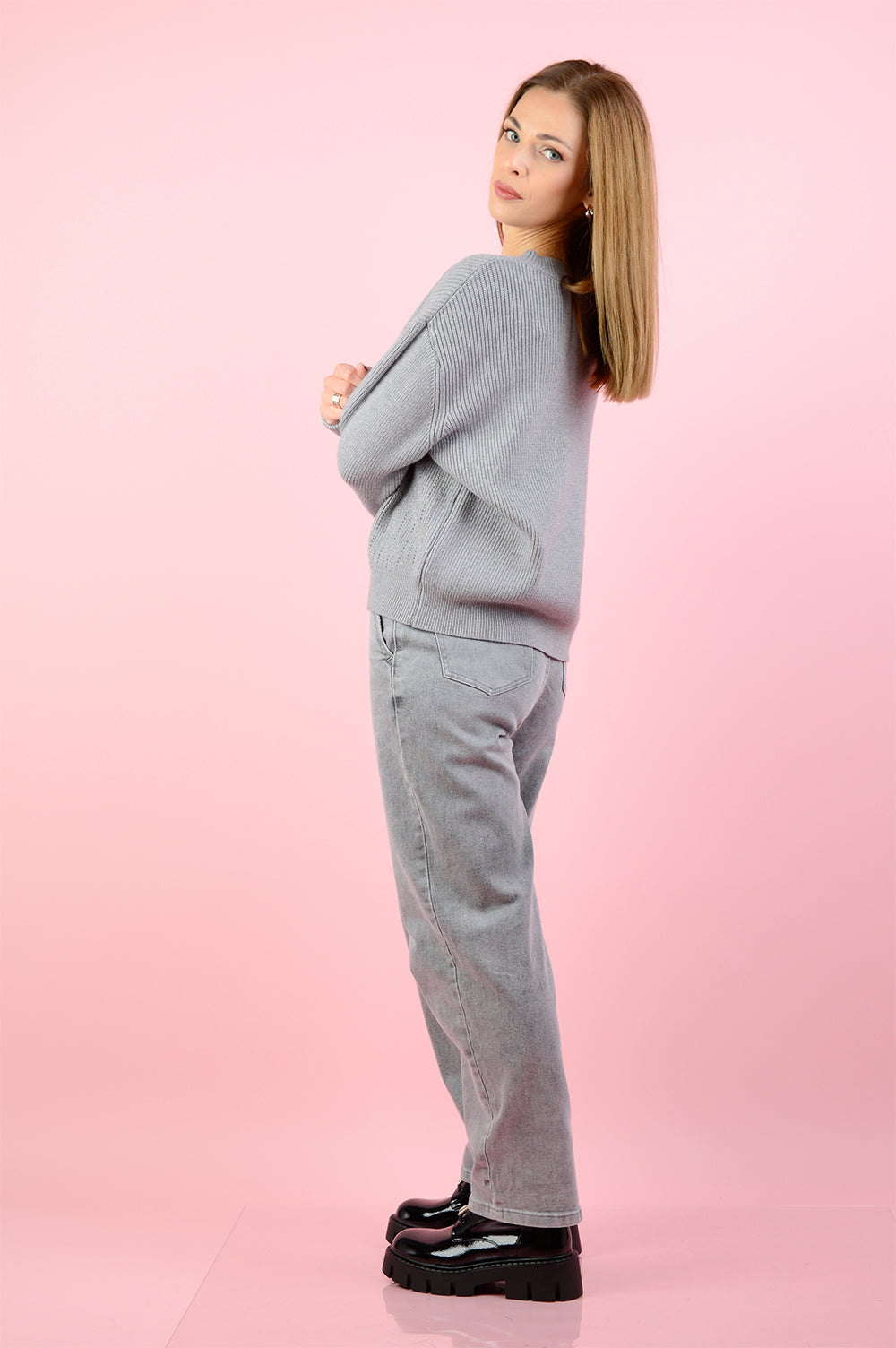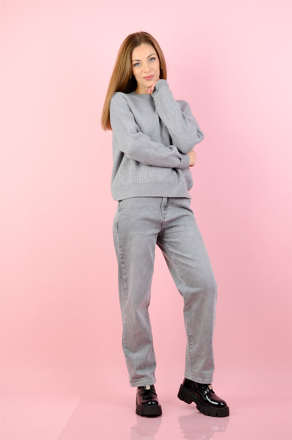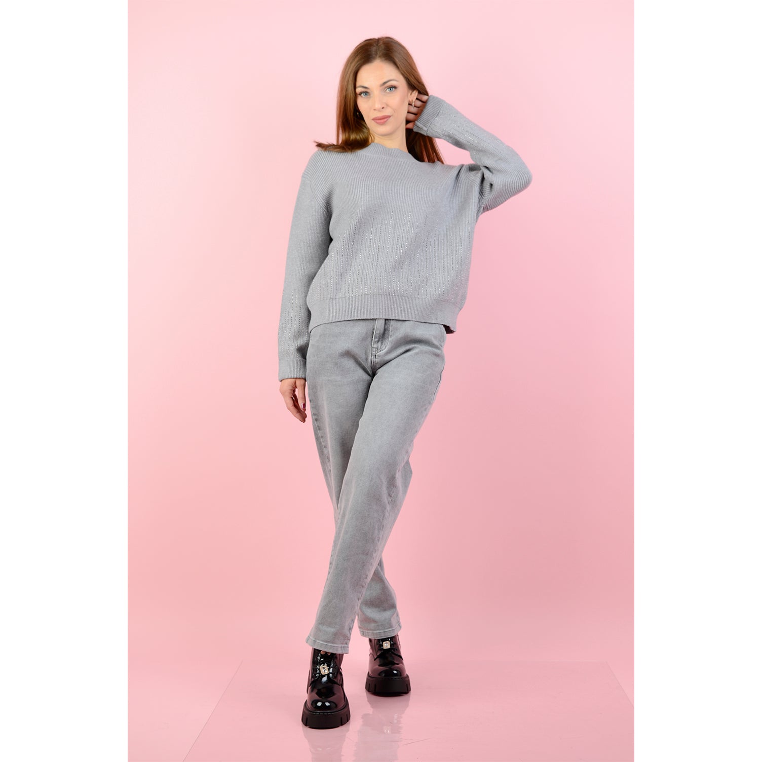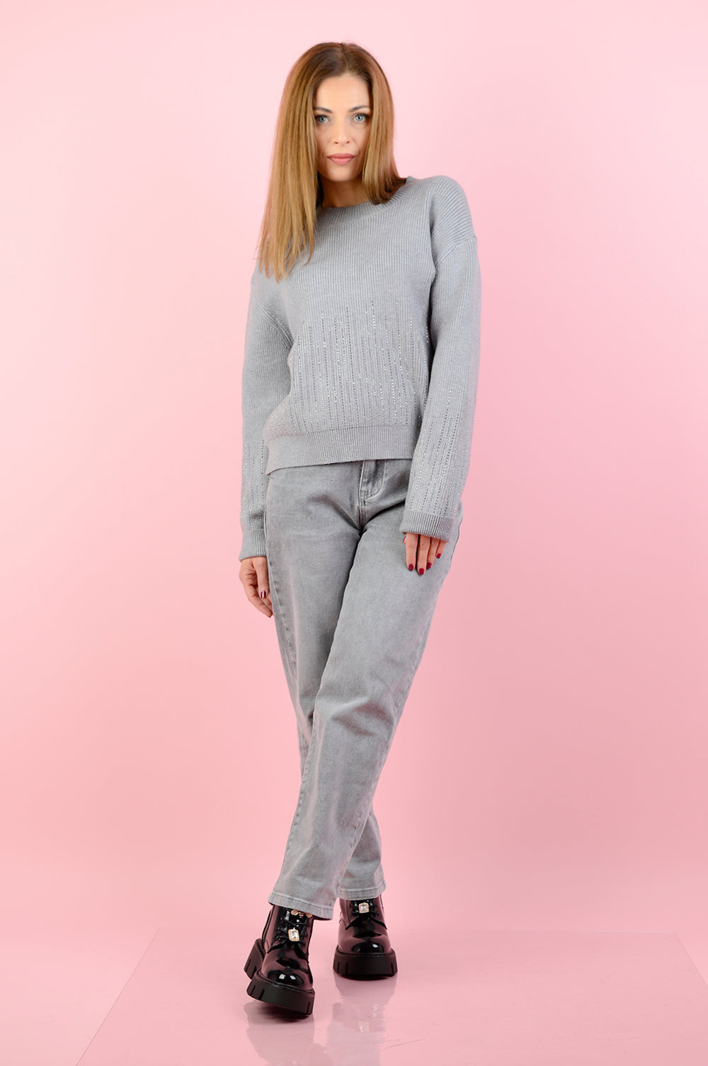Мек и уютен пуловер в нежен сив цвят. Декоративните вертикални елементи отпред и по ръкавите придават лек блясък и интересна структура. Топъл, комфортен и стилен за всеки ден. Универсален размер включващ до L.