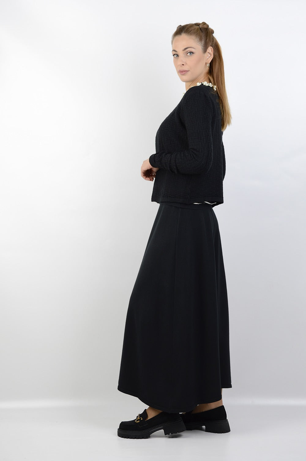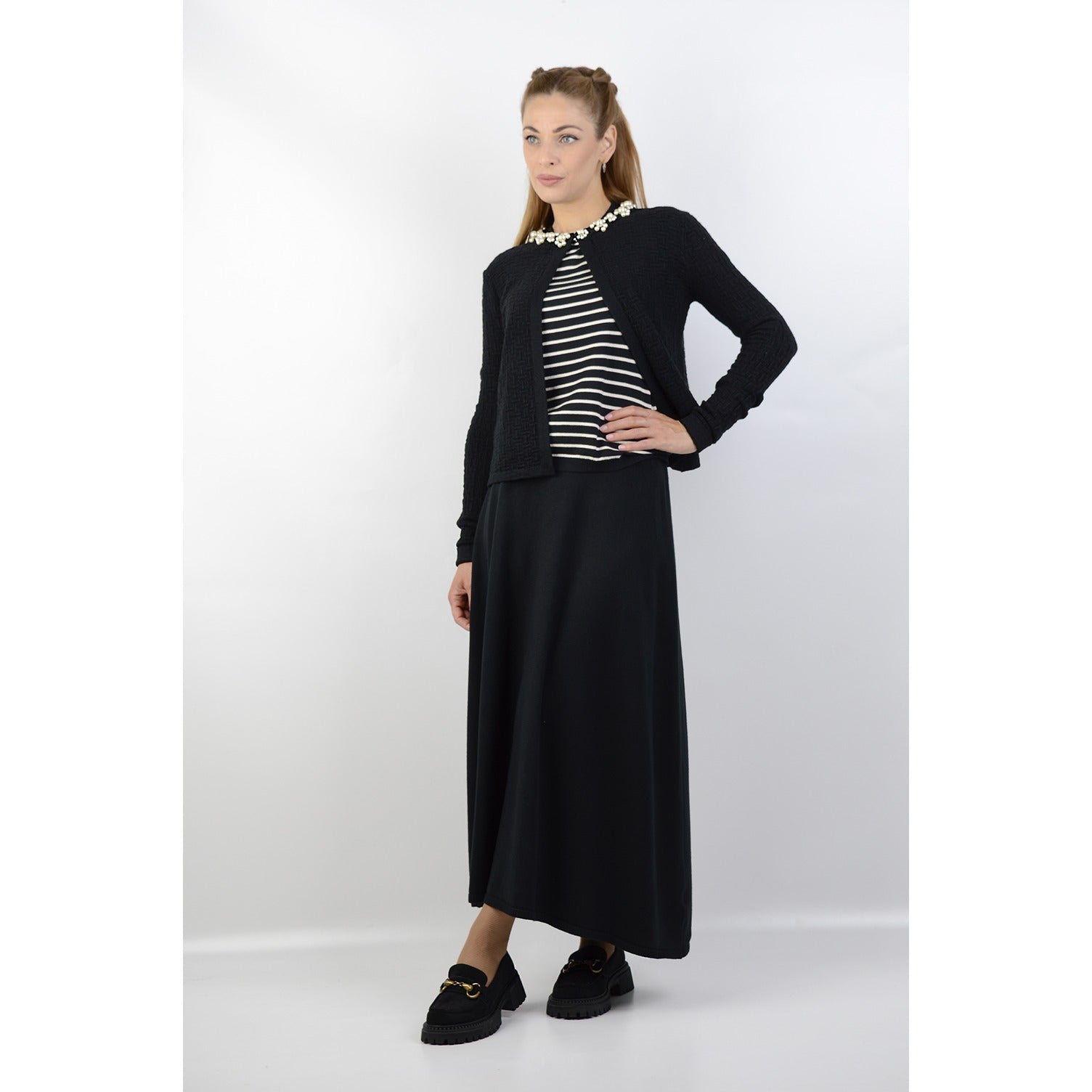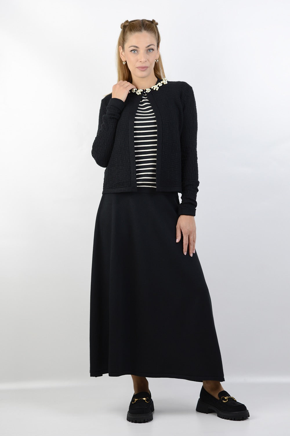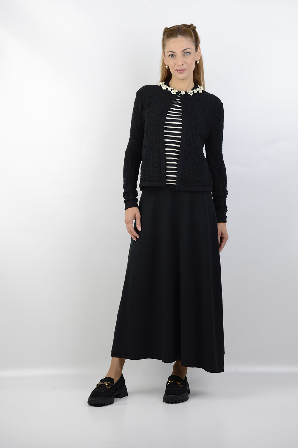 ...стилна и елегантна жилетка в черен цвят, изработена от мека и удобна плетена материя...моделът е с обло деклоте, украсено с нежен перлен акцент, който и придава луксозен завършек....