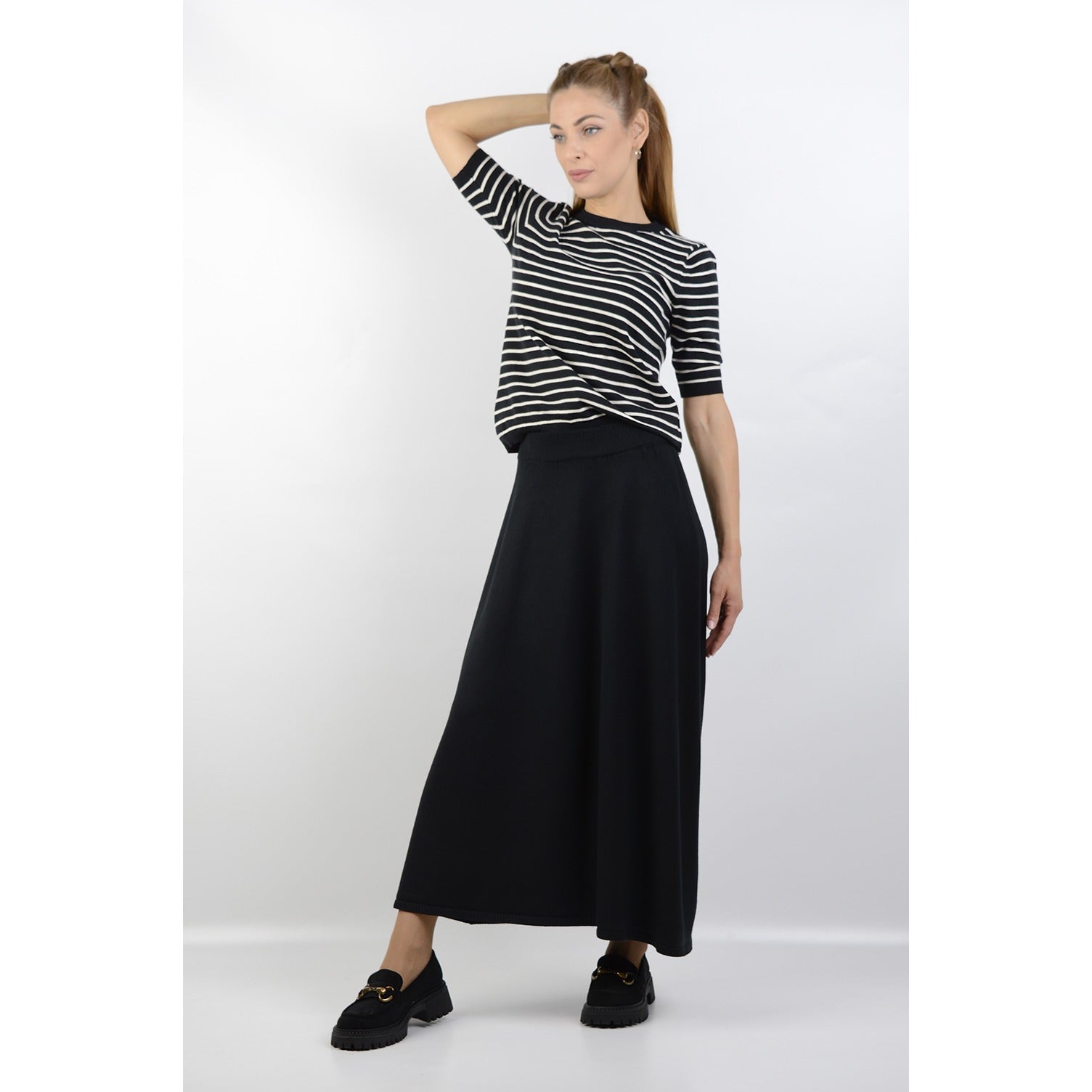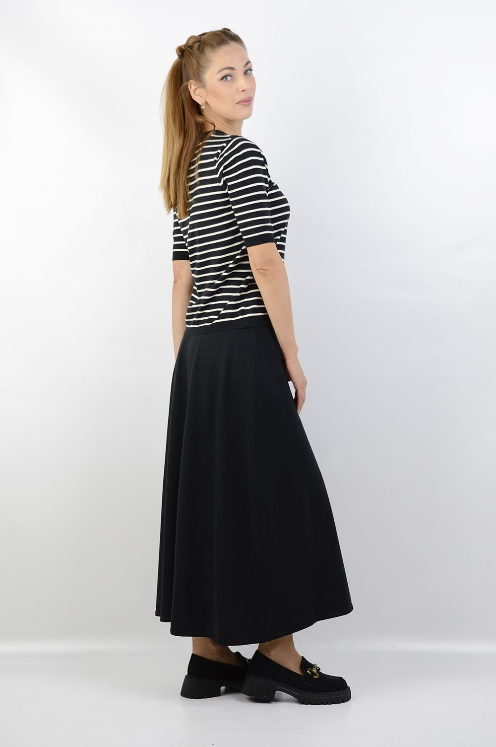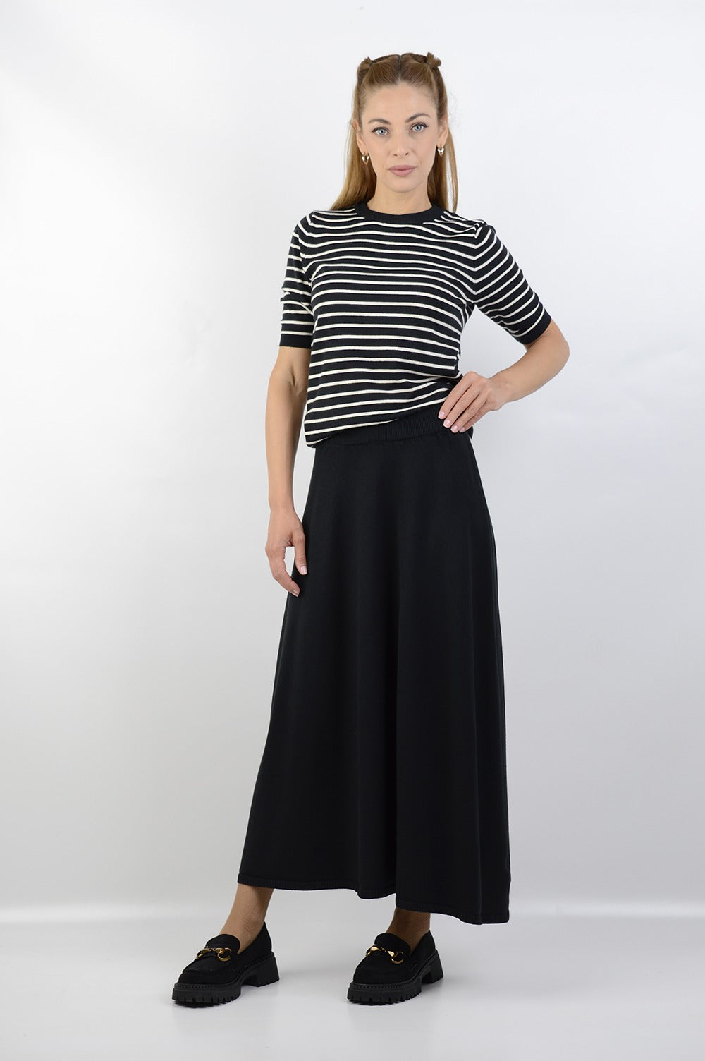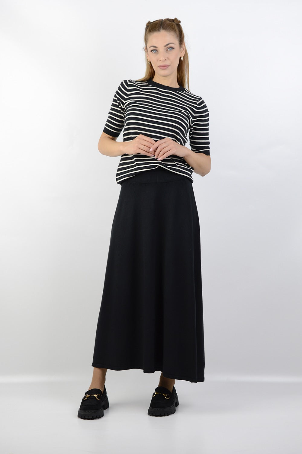 ..комфортна и стилна трикотажна пола изработена от мека и еластична плетена материя, която осигурява свобода на движението и приятна топлина...моделът е с изчистена кройка и ластик в талията, което го прави удобен за носене в ежедневието...