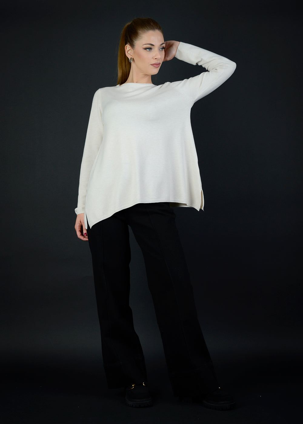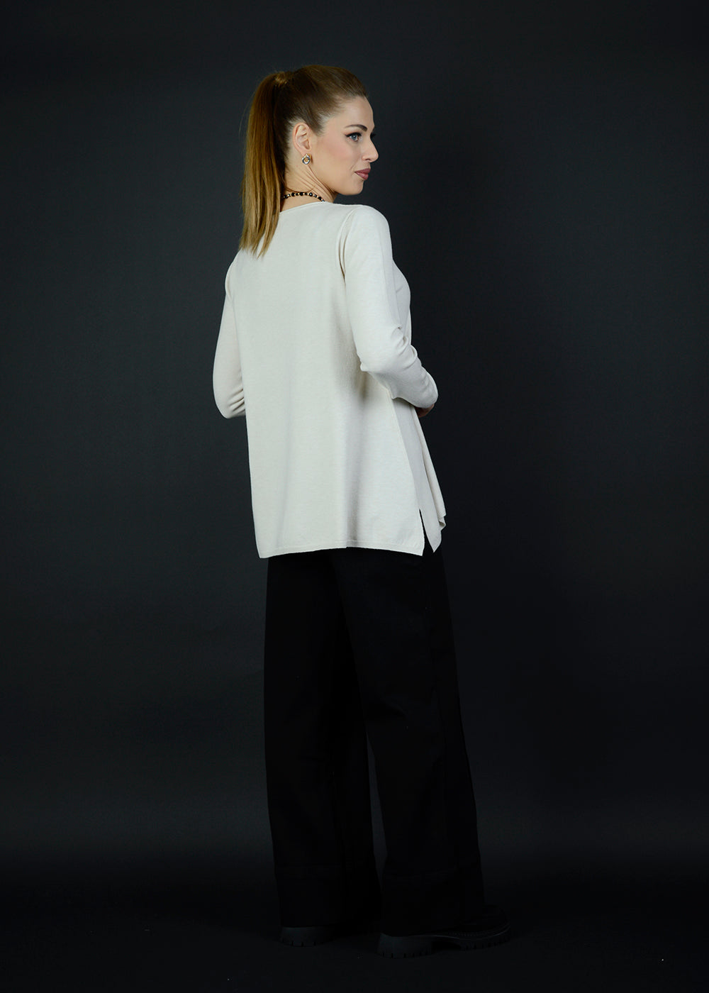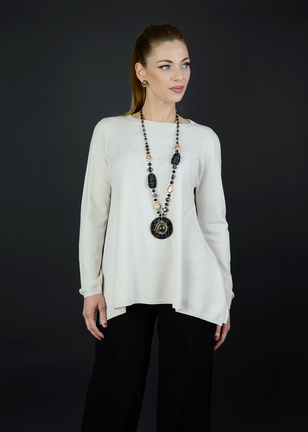 Блуза с изчистен дизайн и разширение в областта на ханша, което осигурява свобода на движение и балансира визията. Моделът пада меко по тялото без да очертава.