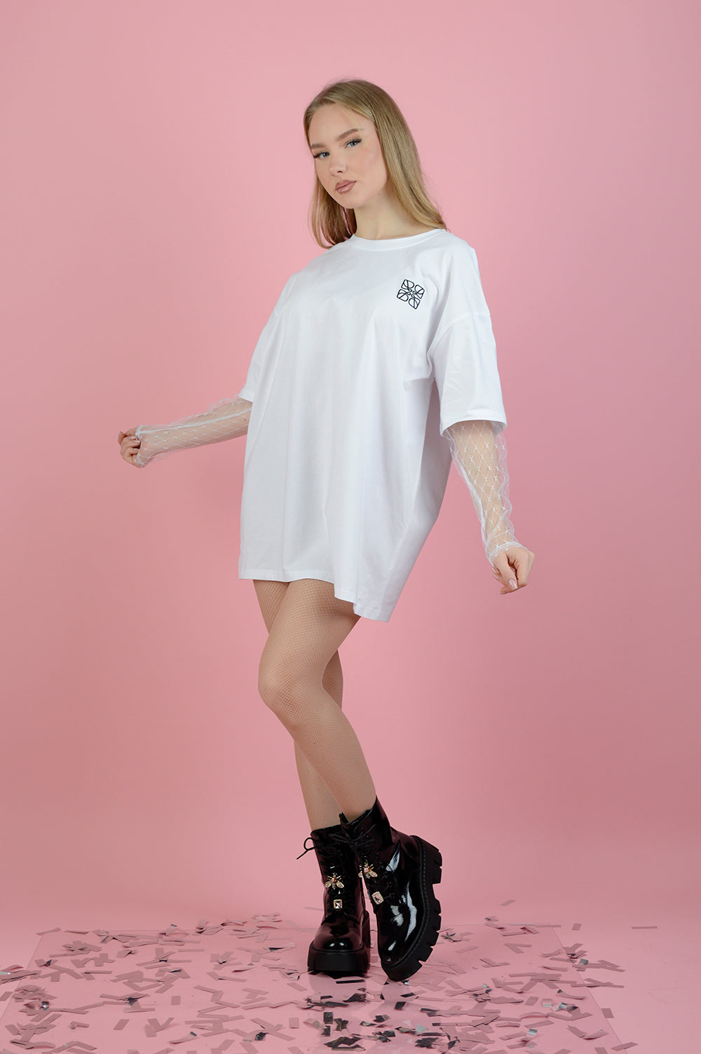 Тази бяла тениска е със свободна линия и ефектен детайл - фин тюл, прикачен към ръкавите, който придава модерен и леко дързък характер на визията.