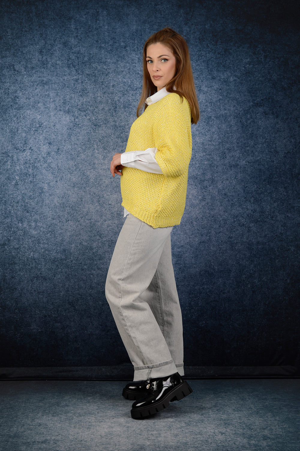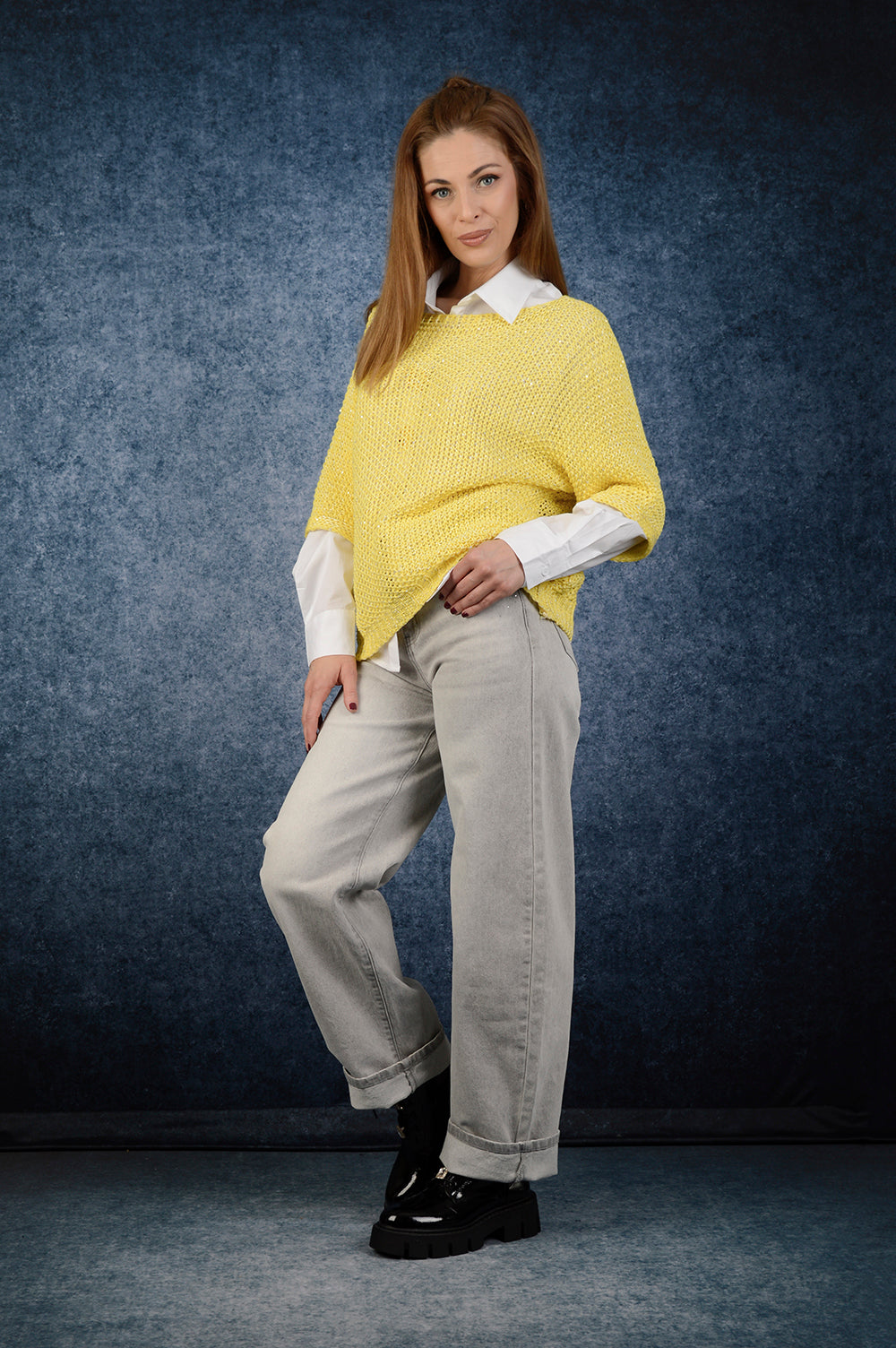 Лек пролетен пуловер с ефирна плетка и свободен силует, който придава усещане за лекота и комфорт. Свежият жълт нюанс носи настроение и се комбинира както с риза, така и самостоятелно.
