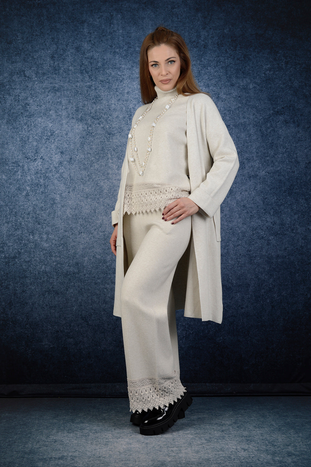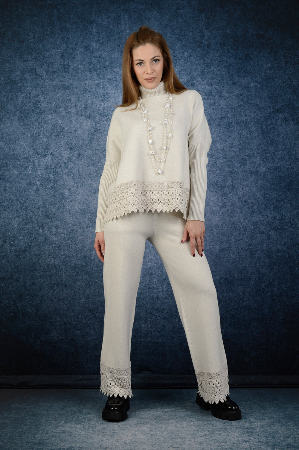 Елегантен комплект от мека трикотажна материя в изискан нюанс на шампанско. Състои се от блуза с поло яка и панталон с права линия, които оформят стилно и завършена визия. Блузата е с акцент на Дантела в долната част, а панталонът повтаря същия детайл при подгъва, създавайки хармония и женственост. Свободният силует осигурява комфорт и елегантност в едно.