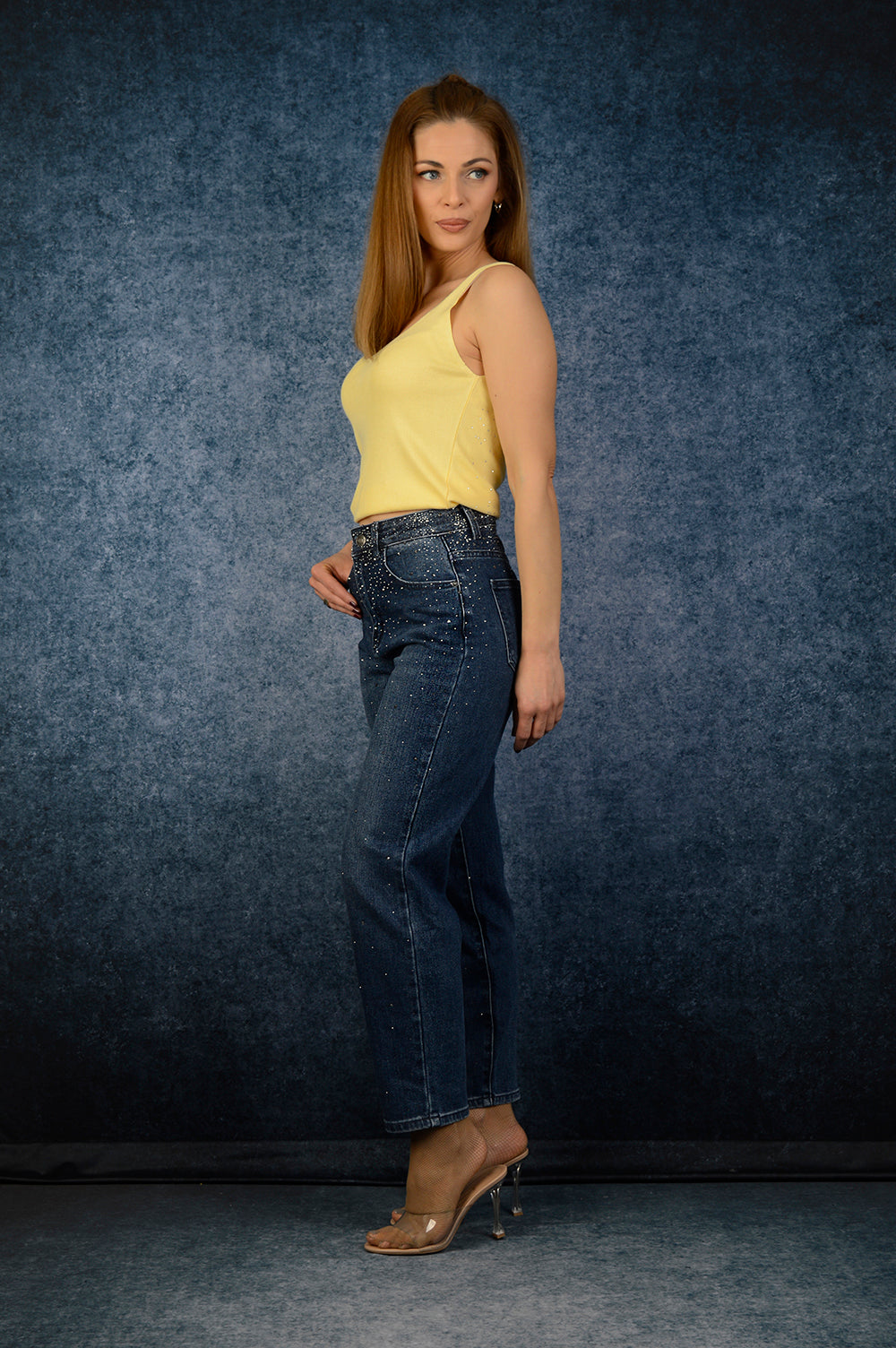 Моделът е изработен от качествен еластичен деним, с права линия и леко свободно падане по крака. Фините камъчета придават блясък, без да натоварват визията. Подходящи за ежедневни комбинации, съчетават се отлично с топ, риза или сако.